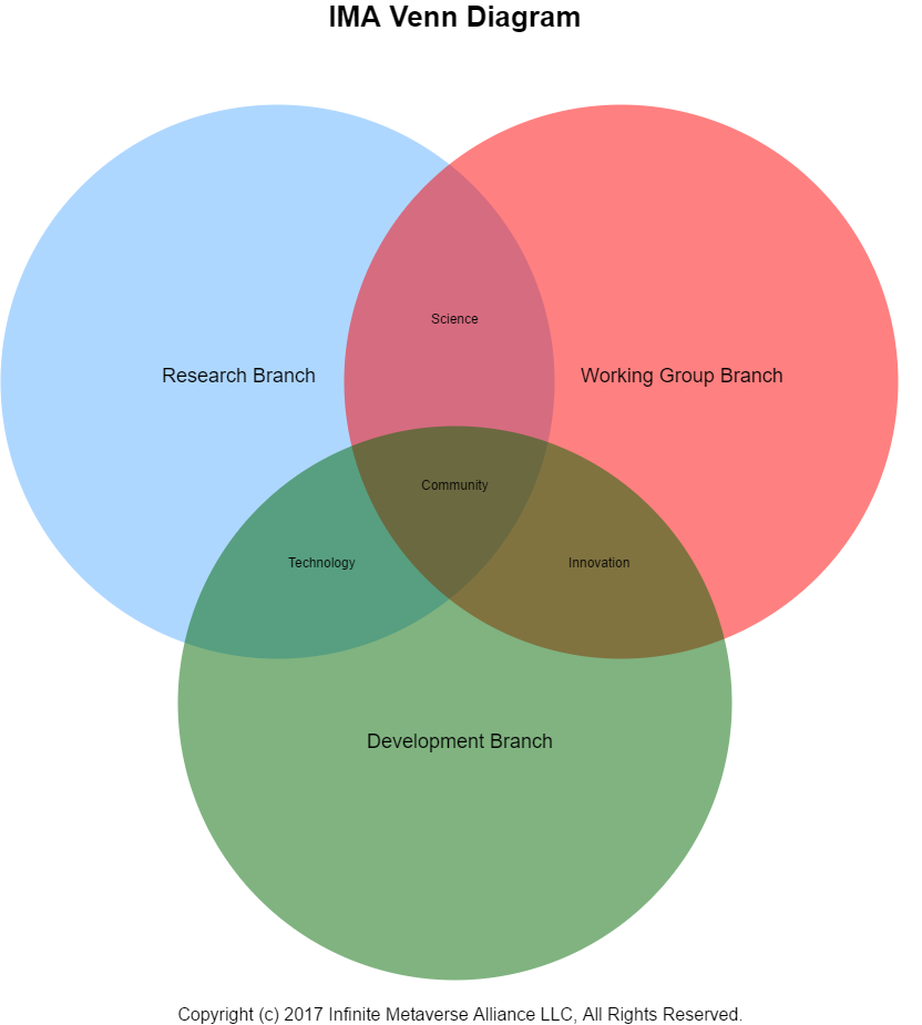 There is a range of membership levels defined in membership options from free social level participation to various levels of sponsor or partner participation. Sponsorship will be used to fund the resources provided to working groups at different levels of activity. IMA has three branches: Research, Development, and Working Group branches - each supports the others. Working together through intersections in science, technology, and innovation, IMA focuses on community. To see the relationship in a broad sense, take a look at this diagram: